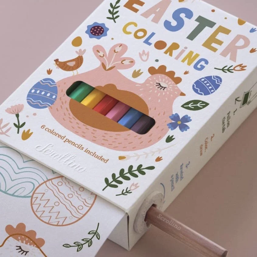 Treat the kids to a fun Easter activity with this Scrollino coloring kit, filled with sweet Easter-themed illustrations. Unroll it all and let their imagination stretch farther than ever before! Use of the the 6 colored pencils to pull back the scroll when not in use. Perfect for taking on the go or for use at home. FSC certified, acid-free heavyweight paper. Designed in France, made in Prague.