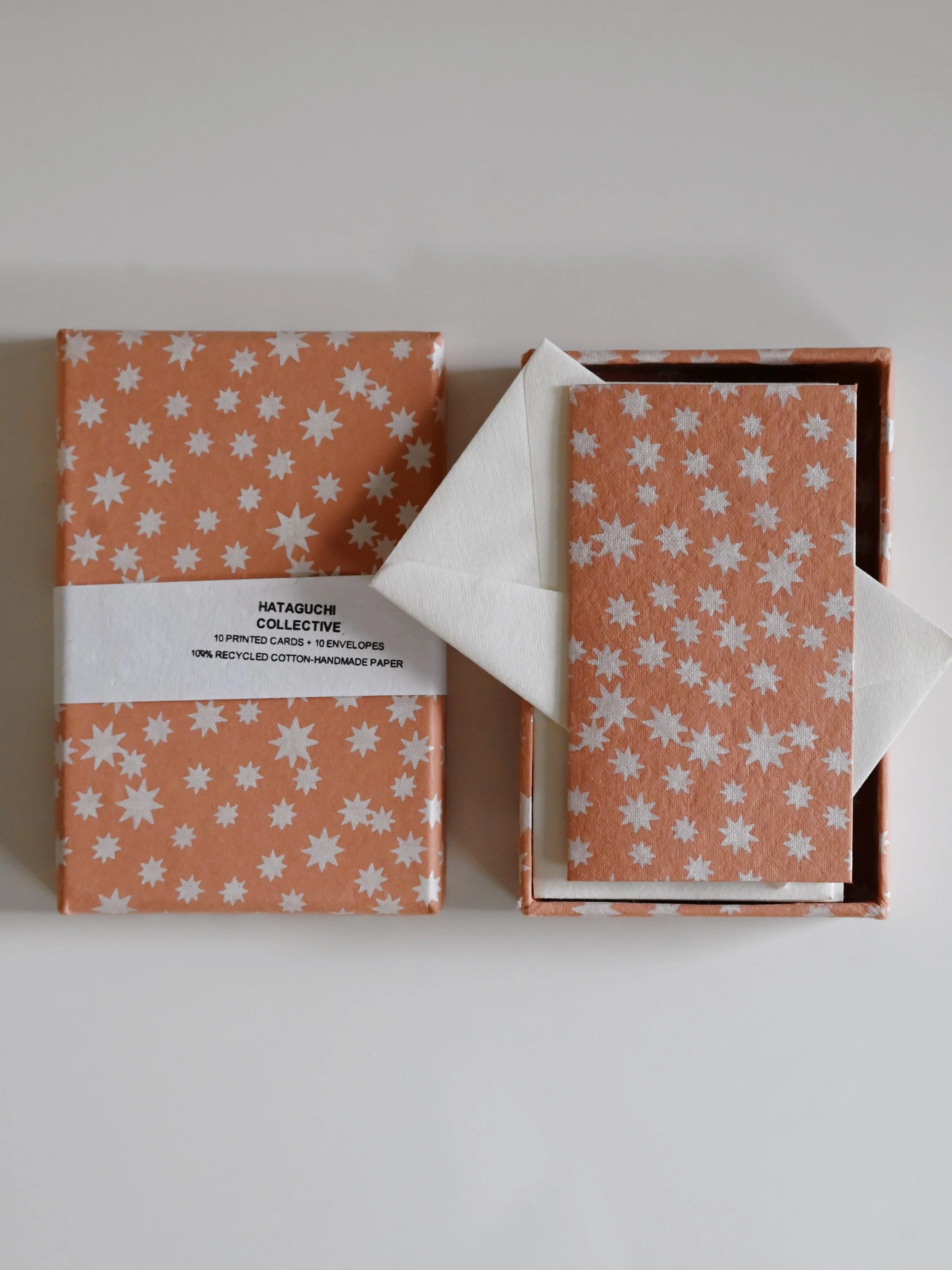 A lovely greeting card set in a matching box! Send that special note of love, appreciation, congratulation, or announcement on these beautifully patterned handmade cotton papers. This set features a peach-colored background with white stars.