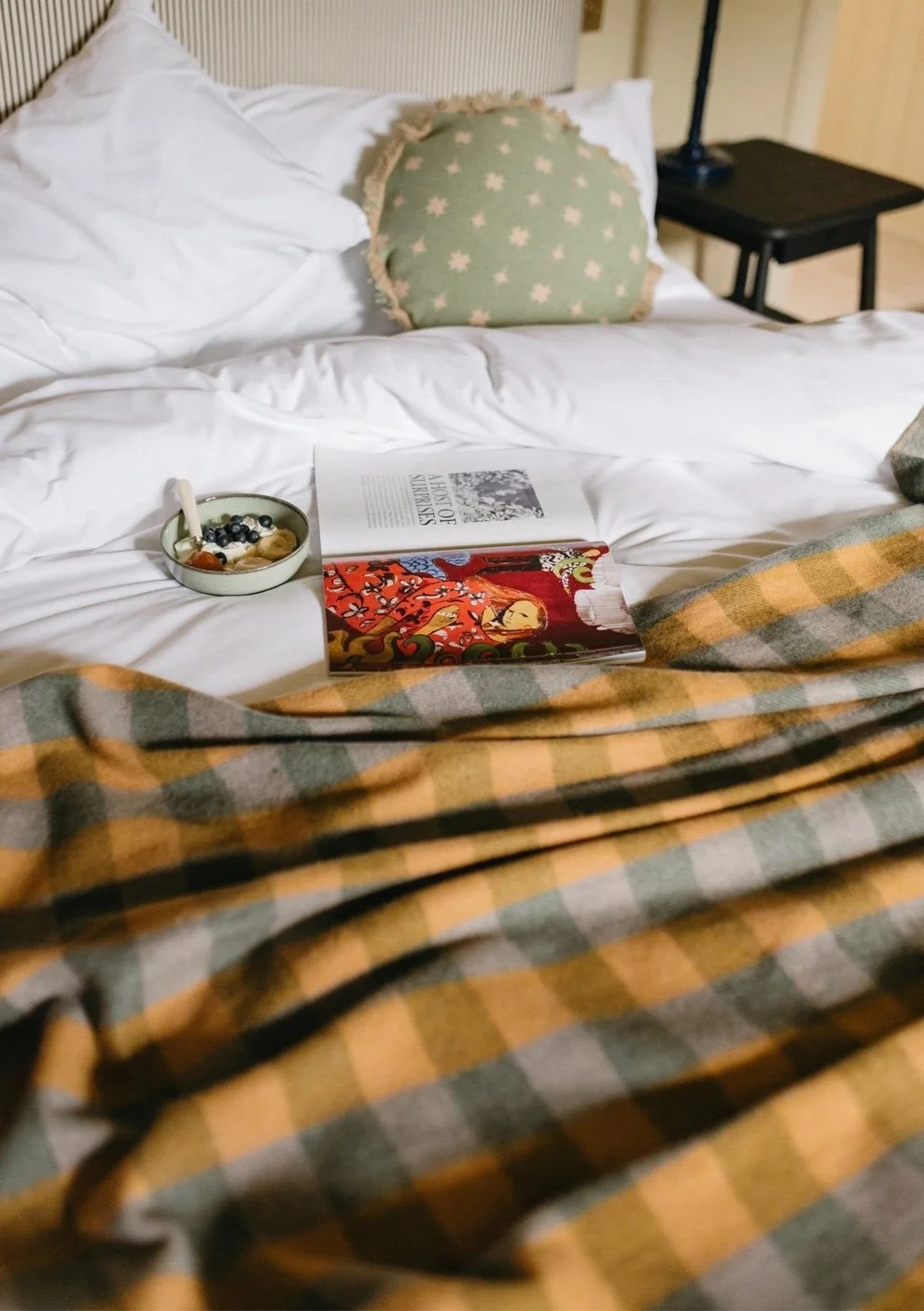 This classic gingham blanket, woven in rich shades of green, mustard and pink, is an invitation to unwind. It's woven from 70% recycled wool and 30% mixed recycled fibres. Designed in their Edinburgh studio, woven in India.